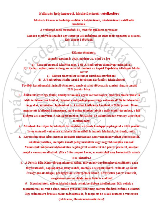 Iskolánk tanulói községi ünnepség keretében emlékeztek meg a 175 éve mártírhalál halt 13 aradi vértanúról 2024. október 03-án. A rossz időjárás miatt a Művelődési Házban került megszervezésre a megemlékezés. Elsőként Ágoston Béla, a település polgármestere köszöntötte a jelenlévőket, megemlékező beszédében a hősi halottak feleségeiknek, családtagjaiknak írt búcsúleveleiből idézett. Ezt követően az Árpád Fejedelem Általános Iskola 8. évfolyamának emlékező műsora következett. A tanulók versekkel, énekkel és táncos produkcióval mutatták be a történelem e fájdalmas eseményének előzményét, és annak következményeit. A műsoruk középpontjában az erkölcsi tartás, a szabadság szeretetétől elválaszthatatlan hazaszeretet megmutatása állt. Az, hogy a szabadságvágy és a hazáért való tenni akarás össze tudja kötni a szerb származású Damjanich Jánost és a magyar származású Török Ignácot, vagy a polgári származású Aulich Lajost és a német főnemesi származású Leiningen-Westerburg Károlyt. Életükkel, de legfőképp azzal, amiért az életüket adták, példát mutatnak nekünk. A felkészítő tanárok Bondár Enikő, Fehér Emil és Szőke Éva voltak.